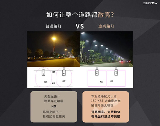 首先,我們來(lái)看到下圖,同樣的路面,使用無(wú)配光設(shè)計(jì)的普通路燈和使用途尚系列路燈專業(yè)道路配光設(shè)計(jì)的路面效果對(duì)比差異,左邊路面亮暗不一,長(zhǎng)時(shí)間在這條道路上行駛,容易引起視覺(jué)疲勞;而右邊光線均勻,讓人視覺(jué)范圍內(nèi)十分清爽。
