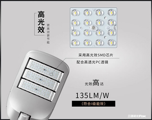 這款途尚路燈采用的是高透光率模組化一體透鏡科學(xué)配光設(shè)計(jì),高光效光源SMD3030+高透光模組一體化PC透鏡,光效高達(dá)135lm/W,符合Ⅰ級(jí)能效。因此,超高光效配合150°x85°大角度出光,明亮均勻度好,貼合整個(gè)路面無(wú)暗區(qū),減少夜間出行視覺(jué)疲勞,大大提升出行安全性。