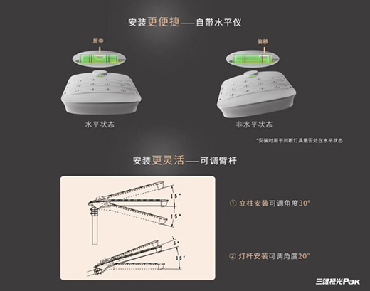 這款途尚路燈有自帶水平儀,可判斷燈具安裝是否處于水平狀態(tài),便于安裝,確保安裝精準(zhǔn)度,還有可調(diào)角度臂桿,燈桿安裝方式可調(diào)角度為20°,立柱安裝方式可調(diào)角度為30°。