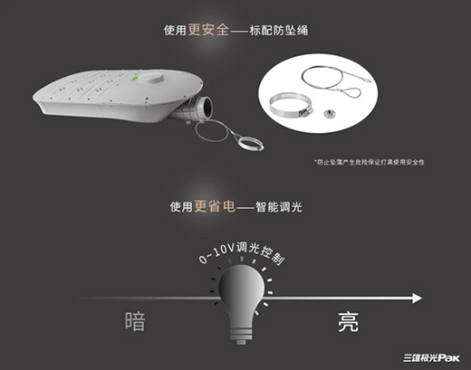 這款途尚路燈還帶有配備防墜繩,防止墜落產(chǎn)生危險(xiǎn),保證燈具使用安全性。另外,它具有0~10V調(diào)光控制,可實(shí)現(xiàn)路燈智能控制調(diào)節(jié),更省電更環(huán)保。