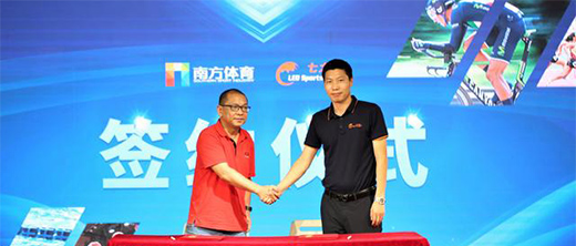 廣東七大洲實(shí)業(yè)有限公司總經(jīng)理張飛虎(右)與南方體育董事總經(jīng)理洪昊(左)