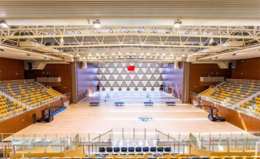 位于二樓的籃球館面積達2200平方米,為專業(yè)級球館,分為一個比賽場和一個訓(xùn)練場館,中間還設(shè)置了兩個羽毛球場。看臺上,1456個黃灰相間的座位讓整個球館看上去生機勃勃,極具現(xiàn)代感。此外,籃球館還可以滿足乙級排球、乒乓球的比賽要求。