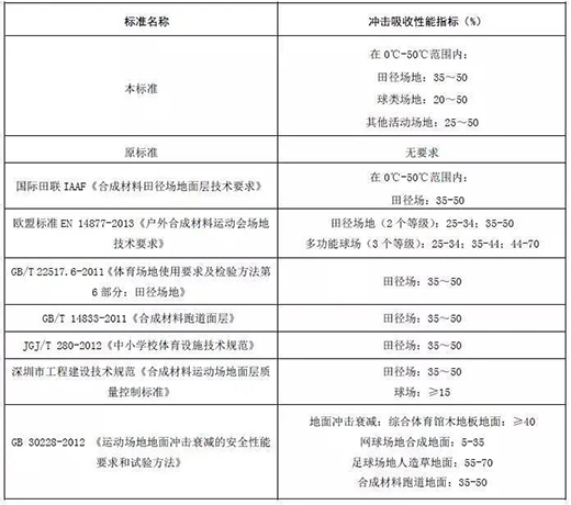 (4)表4是本標(biāo)準(zhǔn)中合成材料面層沖擊吸收性能同其它國內(nèi)外相關(guān)標(biāo)準(zhǔn)的對(duì)比。
