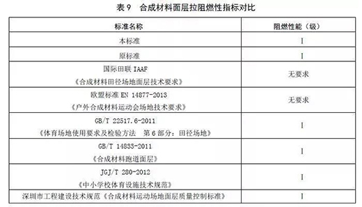 (2)表9是本標(biāo)準(zhǔn)合成材料面層的阻燃性指標(biāo)同國內(nèi)外相關(guān)標(biāo)準(zhǔn)的對(duì)比。