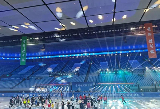 外立面泛光照明采用的智能控制系統(tǒng),展現(xiàn)的燈光秀中既有奧運(yùn)五環(huán)、冬奧吉祥物冰墩墩,也有絲帶飛舞、速滑館卡通人物、禮花綻放、大紅燈籠等數(shù)十種燈光造型,還可以打字、播放圖片等,屋面還有激光燈。