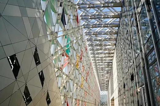 “冰絲帶”為晶瑩剔透的夾膠彩釉彎弧玻璃,營(yíng)造出輕盈飄逸的絲帶效果,整體造型新穎別致,未來(lái)感滿滿。
