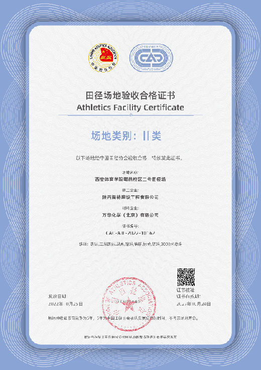 西安體育學(xué)院鄠邑校區(qū)橄欖球場地塑膠跑道工程由一號(hào)田徑場和二號(hào)田徑場兩條400米標(biāo)準(zhǔn)跑道組成,是國內(nèi)少有的雙塑膠跑道工程。萬華化學(xué)提供塑膠跑道系統(tǒng)解決方案,為該項(xiàng)目提供全生命周期的專業(yè)保障。項(xiàng)目驗(yàn)收現(xiàn)場,中國田徑協(xié)會(huì)專家組對(duì)塑膠跑道面層厚度、平整度、坡度、粘接牢固度、畫線數(shù)據(jù)、細(xì)節(jié)處理逐一嚴(yán)格檢測(cè),對(duì)比檢測(cè)報(bào)告中原材料及成品的化學(xué)性能及物理性能指標(biāo),各項(xiàng)檢測(cè)結(jié)果均優(yōu)于現(xiàn)行最新國家標(biāo)準(zhǔn)。 經(jīng)過專家組標(biāo)準(zhǔn)規(guī)范的檢查,一號(hào)和二號(hào)田徑場均達(dá)到Ⅱ類場地驗(yàn)收標(biāo)準(zhǔn),榮獲中國田協(xié)Ⅱ類田徑場地認(rèn)證。