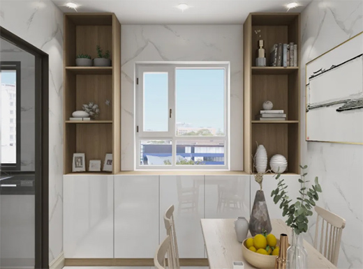 設(shè)計餐邊柜可以增加更多的儲物空間,餐邊柜的樣式可根據(jù)自己的喜好進(jìn)行設(shè)計。這個方案由于過道狹長,所以將餐邊柜設(shè)計于窗前。兩側(cè)高柜可以放置更多物品,但對于采光可能有一定的影響,所以,做矮柜也是不錯的選擇!