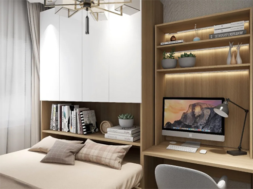 次臥面積過小,正常放置只能容納一張床,所以,可設(shè)計榻榻米增加空間利用率,榻榻米柜設(shè)計下虛上實(shí),便于放些書籍,雜物等。旁邊還可以設(shè)計寫字臺,空間雖小但五臟俱全。