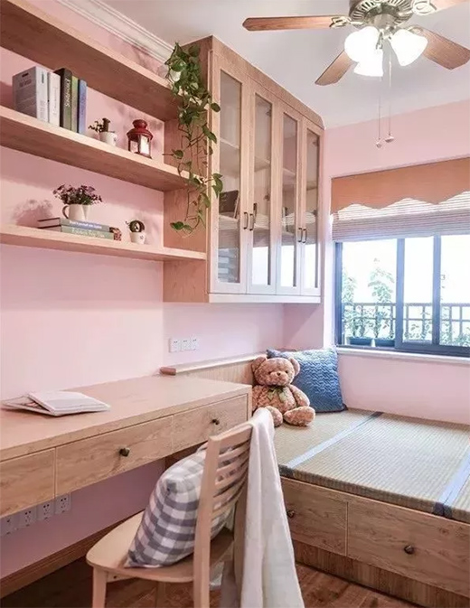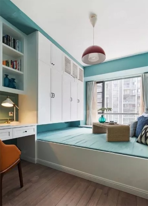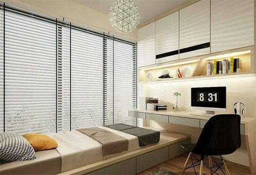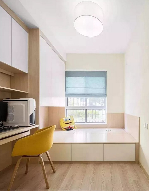 如果你希望裝榻榻米的這間房既可以當(dāng)臥房又可以當(dāng)書房,可以選擇在榻榻米床頭或者床尾安裝衣柜、書架和書桌,這樣不僅可以收納衣物,也可以收納書架用來辦公,一舉多得。