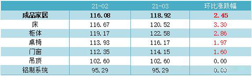 3月,成品家居交易狀況良好,成品家居價(jià)格指數(shù)收?qǐng)?bào)118.92點(diǎn),環(huán)比上漲2.45%。細(xì)分品類中,床的價(jià)格上漲幅度最大,柜體價(jià)格漲幅次之。除吊頂和鋁制系統(tǒng)外,各項(xiàng)細(xì)分品類價(jià)格均有上漲。
