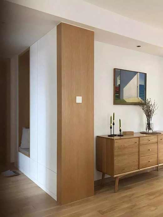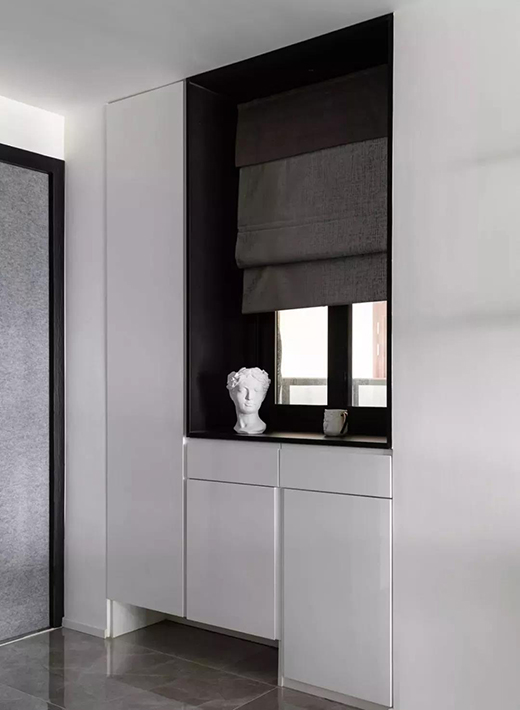 在玄關(guān)柜高至腰部的位置挖空設(shè)置壁龕,就能順手放置包包或者零碎物件,臨出門時找不到鑰匙卡包等情況就能輕松擺脫。