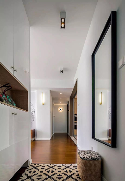假如對顏值和功能性要求再高一些的話,把玄關(guān)柜做成推拉門,再把其中一扇門做成鏡子兩用。出門前照鏡子拾捯一下,回到家輕輕一推就一股腦把所有東西丟進去。