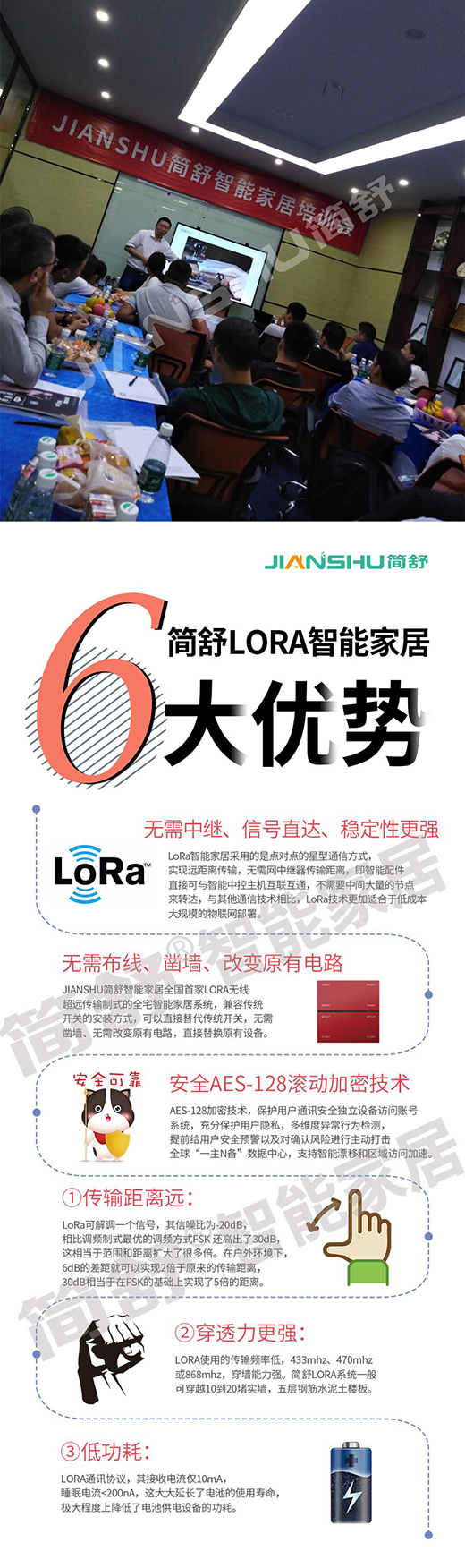 同質(zhì)化嚴(yán)重的問(wèn)題影響著每一個(gè)行業(yè),智能家居也不例外,產(chǎn)品優(yōu)勢(shì)和服務(wù)都已經(jīng)成為了智能家居市場(chǎng)上差異化的重要競(jìng)爭(zhēng)點(diǎn),LORA作為一種能夠替代有線智能家居的無(wú)線通訊協(xié)議,整合了數(shù)字?jǐn)U頻、數(shù)字信號(hào)處理和前身糾錯(cuò)編碼技術(shù),具備了信號(hào)遠(yuǎn)距離傳輸、信號(hào)穿墻能力強(qiáng)(可穿8層水泥鋼筋墻)、信號(hào)抗干擾能力強(qiáng)(同頻率同時(shí)間發(fā)出也不會(huì)受到干擾)、系統(tǒng)穩(wěn)定性強(qiáng)等天然優(yōu)勢(shì),JIANSHU簡(jiǎn)舒智能家居作為首批LORA智能家居研發(fā)生產(chǎn)的優(yōu)質(zhì)品牌,已經(jīng)落地安裝應(yīng)用到多戶家庭中,取得了非常良好的口碑,解決了人們對(duì)于無(wú)線智能家居信號(hào)差、系統(tǒng)不穩(wěn)定等不好的印象。