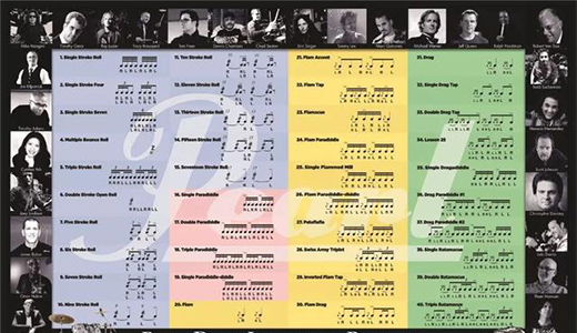 30年代,美國(guó)全國(guó)基礎(chǔ)鼓手協(xié)會(huì)(N.A.R.D)從每個(gè)州挑選出一位出色的鼓手,請(qǐng)他們挑出一條自己認(rèn)為最有幫助且不能重樣的Rudiments,湊在一起就形成了最早的“13條”。第二年,協(xié)會(huì)請(qǐng)13位鼓手再次挑出13條Rudiments之后就有了傳統(tǒng)的26條,也就是著名的Rudiments26。