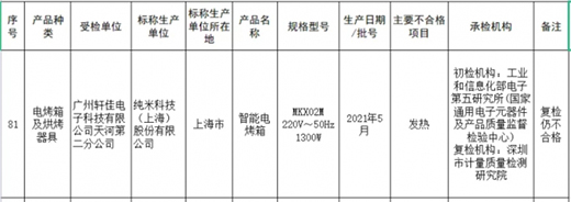 2022年2月8日,純米科技(上海)股份有限公司收到了上海市崇明區(qū)市場監(jiān)督管理局的行政處罰,沒收416元,罰款6375元。處罰原因為:純米科技生產的智能電烤箱,型號為“MKX02M220V~50Hz 1300W”的產品,發(fā)熱項目不符合GB4706.1-2005、GB4706.14-2008標準,此后純米科技還曾申請復檢,但二次檢測后依然不合格。