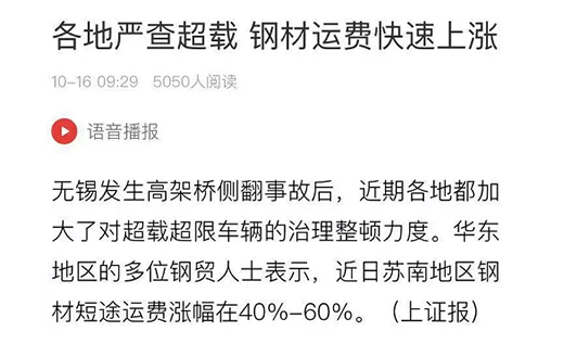 據(jù)各大媒體新聞報道:無錫事件后,各地嚴查超載,當(dāng)?shù)劁摬倪\費大漲40%-60%!