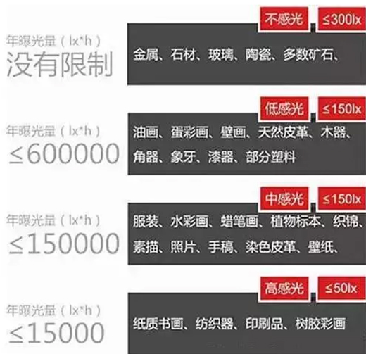 為了展品的安全,應(yīng)當(dāng)注意光輻射對(duì)展品的損害,對(duì)燈具的紫外線和紅外線使用濾鏡進(jìn)行過濾,對(duì)于展品的照度水平也要嚴(yán)格控制,同時(shí)對(duì)展品燈光的年曝光量進(jìn)行控制。