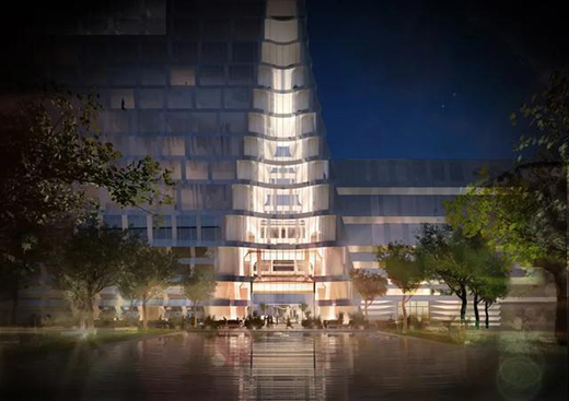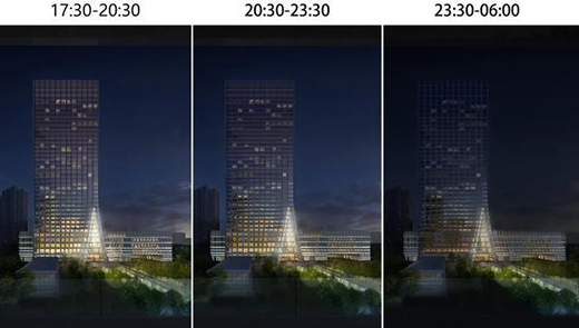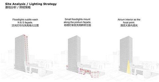 在此項(xiàng)目中,遵循酒店塔樓 “中國(guó)傳統(tǒng)折紙燈籠”的概念,在夜晚強(qiáng)化建筑的南北立面,并保證不影響酒店的客人和對(duì)面的居民;同時(shí)強(qiáng)化東西立面上40米高的“A”型大堂的特點(diǎn),使建筑看上去就像被拉開了帷幕的一角,透出酒店內(nèi)部的氛圍,并通過專業(yè)計(jì)算確定數(shù)值使兩側(cè)坡面蒙上一層均勻柔和的燈光,內(nèi)外燈光的搭配呼應(yīng),烘托出酒店整體就如同一個(gè)生命體,在夜晚綻放光彩。
