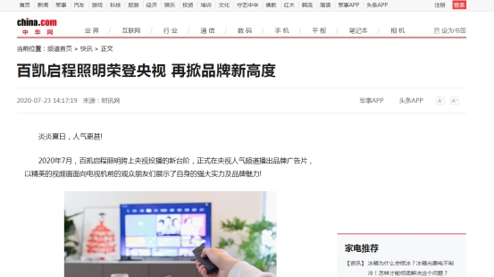 由代表中國(guó)名聲和形象的國(guó)家級(jí)門戶網(wǎng)站《中華網(wǎng)》報(bào)道的這一篇文章,以一個(gè)醒目的標(biāo)題《百凱啟程照明榮登央視 再掀品牌新高度》成功吸引了一大批網(wǎng)友的注意。文章既明確傳達(dá)了百凱啟程照明曾在央視人氣頻道播出品牌廣告片的信息,又側(cè)面透露出百凱啟程品牌的強(qiáng)勁綜合實(shí)力,讓閱讀過文章的網(wǎng)友對(duì)百凱啟程有了更多的好感與消費(fèi)欲望。