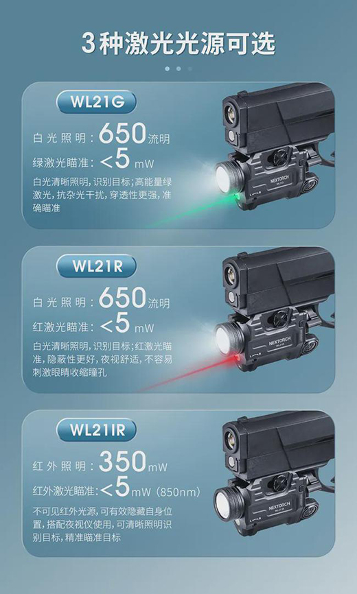 提供WL21G白光照明+綠激光瞄準、WL21R白光照明+紅激光瞄準、WL21IR紅外照明+紅外瞄準共3種激光光源,可根據(jù)不同任務(wù)需求適當搭配,成為暗弱光執(zhí)法下的有效助力。