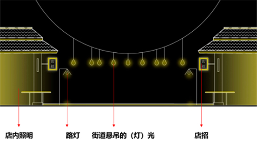一是包含店內(nèi)照明、路燈的光、街道懸吊的(燈)光、店招四個(gè)方面的氛圍光;
