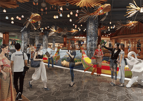 從整體平面空間上看,需打造以店鋪亮、街道暗的整體燈光氛圍;在打卡景點(diǎn),加強(qiáng)環(huán)境光和面光的補(bǔ)充,有利于顧客拍照;在水景區(qū)域,需要重點(diǎn)刻畫和突出,用流動(dòng)的“水”元素,增加商業(yè)空間氛圍美的同時(shí),加強(qiáng)了東南亞地區(qū)對(duì)水蘊(yùn)含的情感的民族特色文化傳達(dá)。