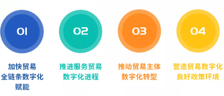 《規(guī)劃》中提出構(gòu)建綠色貿(mào)易體系,包括加快貿(mào)易全鏈條數(shù)字化賦能、推進服務(wù)貿(mào)易數(shù)字化進程、推動貿(mào)易主體數(shù)字化轉(zhuǎn)型,鼓勵數(shù)字賦能,大力發(fā)展數(shù)字貿(mào)易,加快發(fā)展跨境電商、市場采購貿(mào)易、企業(yè)海外倉、保稅維修等貿(mào)易新業(yè)態(tài)新模式,從而促進外貿(mào)的數(shù)字化轉(zhuǎn)型,增強外貿(mào)創(chuàng)新發(fā)展的內(nèi)生動力。具體落實措施包括推動外向型產(chǎn)業(yè)依托產(chǎn)業(yè)互聯(lián)網(wǎng)平臺提升智能制造水平;搭建云展會等線上平臺,促進數(shù)字化營銷;拓展國際貿(mào)易“單一窗口”功能,推動通關(guān)智能化,持續(xù)推進進出口許可證件無紙化,支持生產(chǎn)型外貿(mào)企業(yè)開展產(chǎn)品研發(fā)等全價值鏈數(shù)字化轉(zhuǎn)型。鼓勵貿(mào)易型企業(yè)提升數(shù)字化服務(wù)水平,提供智能、便捷、高效的服務(wù)等內(nèi)容。