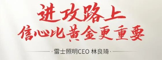 有一句話叫做“信心比黃金更重要”。疫情常態(tài)化等不可抗力因素,讓所有企業(yè)遭遇的困難基本一致,也是對企業(yè)抗風(fēng)險能力與創(chuàng)新應(yīng)變能力的一次檢驗。這個時候,我們一定要增強信心,用辯證的思維來看待危機背后的機會,每一次危機都是行業(yè)的洗牌,強者恒強。我們要對中國經(jīng)濟有信心,對照明行業(yè)有信心,對雷士照明的未來有信心。