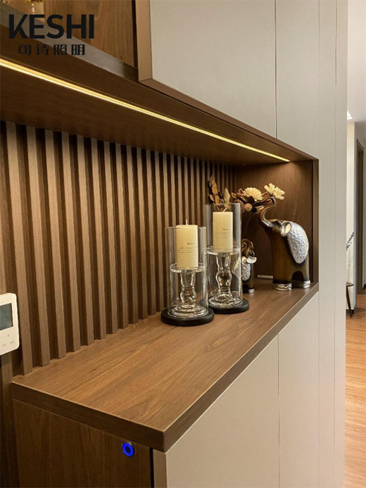 玄關(guān)柜安裝了感應(yīng)柜燈,采用的是觸摸開關(guān),使用起來更便捷。有了線條燈的點(diǎn)綴,整個柜子的造型感更強(qiáng),讓玄關(guān)也能成為一道令人矚目的風(fēng)景線,且線條燈的延伸也讓人覺得玄關(guān)變得更為寬敞綿長起來,從視覺上看,空間延伸感更強(qiáng)。
