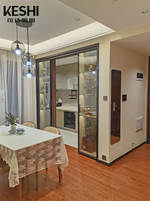 值得一提的是,廚房的玻璃門別有玄機(jī)。平常拉開門時,玻璃門是酒柜門,而拉上門時,玻璃門又能作為廚房門,一門兩用,著實(shí)巧妙。