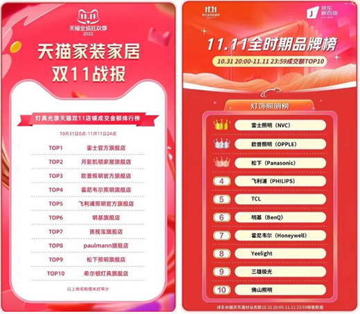在京東“11.11全時期品牌榜—燈飾照明成交額TOP 10”榜單(統(tǒng)計時間:10月31日20點—11月11日23點:59分)中,第一名至第十名排名分別是:雷士照明、歐普照明、松下、飛利浦、TCL、明基、霍尼韋爾、Yeelight易來、三雄極光、佛山照明。