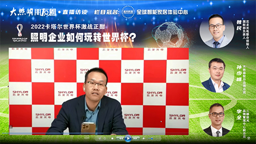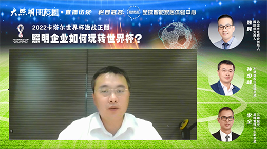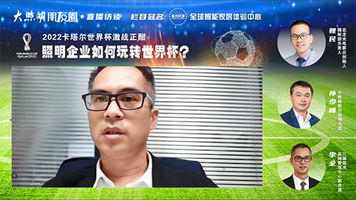 當(dāng)天下午,芯龍光電聯(lián)合創(chuàng)始人、國際部負(fù)責(zé)人魏民,木林森股份品牌總監(jiān)孫少峰,三雄極光品牌管理中心副總監(jiān)李全以線上連線的形式空降大照明直播間,大照明全平臺聯(lián)席總裁唐斌擔(dān)綱主持,一同暢聊“照明企業(yè)如何玩轉(zhuǎn)世界杯?”。