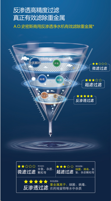 長效反滲透濾芯是A.O.史密斯商用凈水的核心專利,能夠有效濾除水中病細菌、病毒、余氯、重金屬離子、抗生素等有害物質(zhì)。