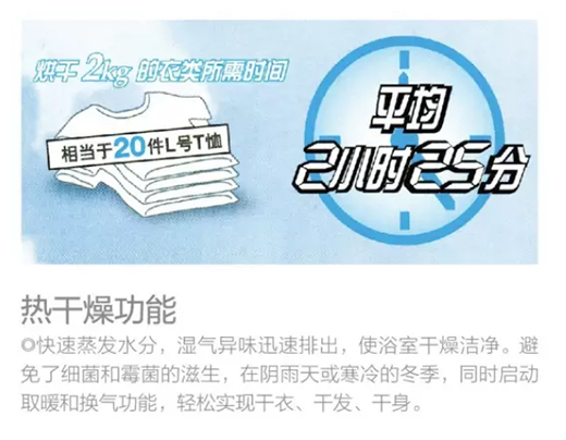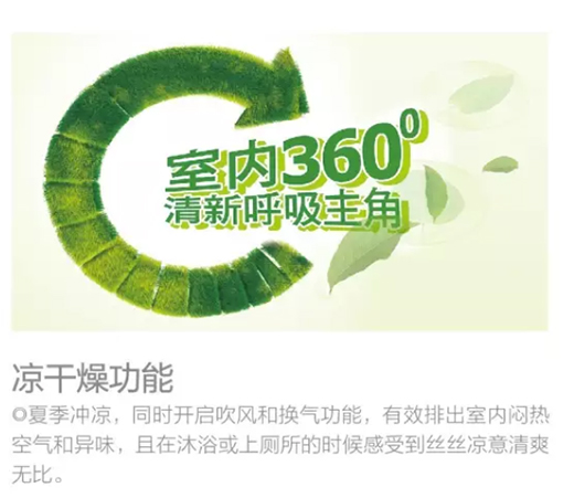 除了實現(xiàn)高效快速取暖和換氣的常用功能,涼干燥讓你在夏天淋浴時能享受自然風(fēng)的清爽。淋浴后,身上和化妝鏡上的水汽也被涼干燥(涼風(fēng)及換氣)快速風(fēng)干,達(dá)到對家人健康著衣的關(guān)愛。熱干燥為一鍵取暖、換氣雙模式同時啟動,實現(xiàn)干衣、干發(fā)、干身功能,特別在梅雨季節(jié),是生活不可多得的干衣好幫手。