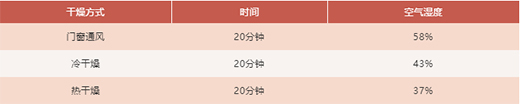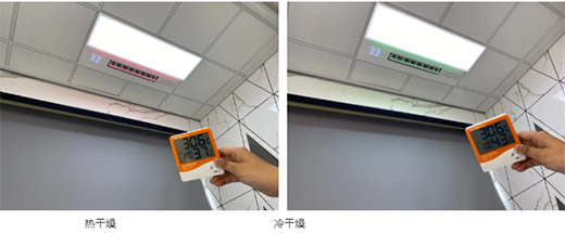 我們打開測試間花灑,連續(xù)出水10分鐘,模擬人日常洗澡的效果,經(jīng)過10分鐘的出水,室內(nèi)環(huán)境濕度高達78%。之后我們對“涼干燥”、“熱干燥”功能進行了測試。最終得到了3組數(shù)據(jù)。