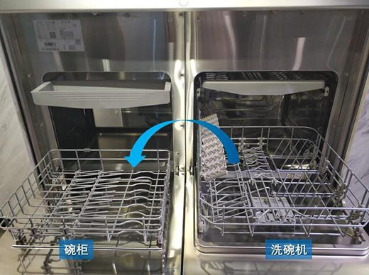 在機(jī)器的左下部分則是碗柜模塊,和洗碗機(jī)模塊連在一起。當(dāng)餐具清洗完畢后,只需微微側(cè)身,就能實(shí)現(xiàn)餐具的取放,再也不用在廚房里來回搬運(yùn)餐具,非常方便。
