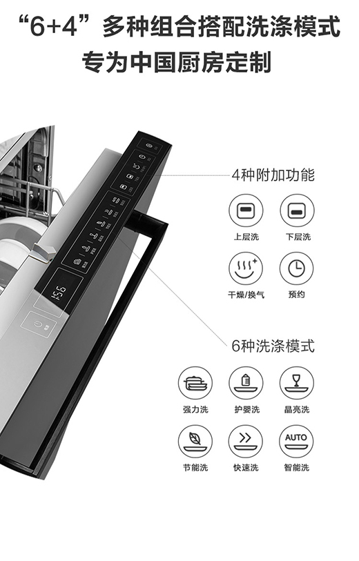老板W735洗碗機具有“6+4”多種組合搭配洗滌模式,可根據(jù)不同需要切換不同洗滌模式,例如對于重油污的餐具可采用“強力洗”;而對于寶寶奶瓶這些需要呵護的餐具,則可采用“護嬰洗”;如果是混搭,各種餐具都有,也可以選擇“智能洗”模式,直接交給洗碗機去判斷,洗碗機中搭載的渾濁度傳感器,會根據(jù)水流的污濁度,感應(yīng)出餐具的油污程度,智能匹配洗滌模式;如果是餐具比較少,“節(jié)能洗”模式就該派上用場了;而“快速洗”模式主要應(yīng)對餐具不夠的情況,可以馬上救急;“晶亮洗”則可以讓餐具煥然一新。老板W735的多重洗滌模式,可以滿足中式廚房的多種場景的洗滌需求。