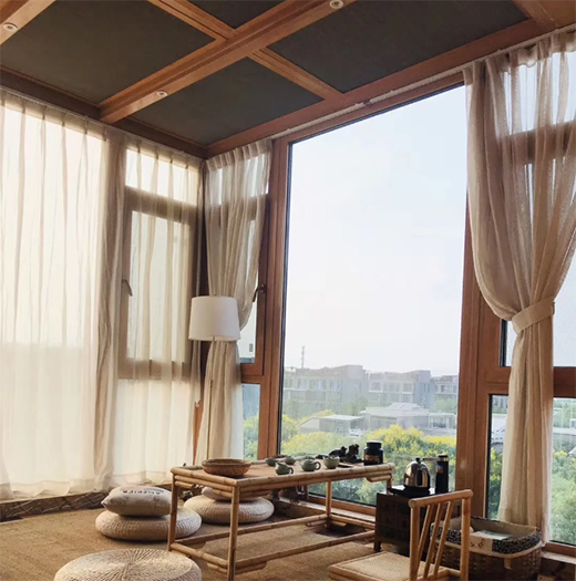 把陽(yáng)臺(tái)做成陽(yáng)光房后,可以考慮添一張木質(zhì)長(zhǎng)桌、幾把精致桌椅,這些元素都定格了茶室的中式意蘊(yùn)。茶室的材料以竹、木、藤、麻、布等為主,給人清雅脫俗之感。