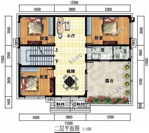 布局說明:一層兩室兩廳一廚一衛(wèi),室內(nèi)私密性好,二層三室一廳一衛(wèi),配娛樂室和室外觀景大露臺(tái)。