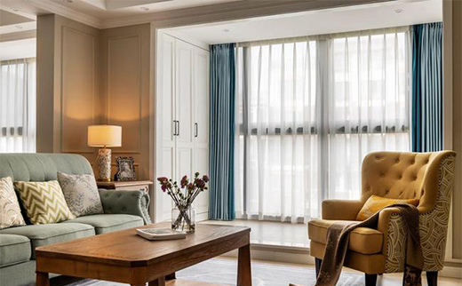 客廳豐富的色彩搭配,盡顯空間的層次感,通體的落地窗將自然光最大程度的引入室內(nèi),使客廳通透明亮,同時也帶來了不錯的景致,讓靜柔舒緩的空間多了一份俏皮和天然的清新感。美式風情彌漫在空間中,營造著溫馨雅致的生活氛圍。
