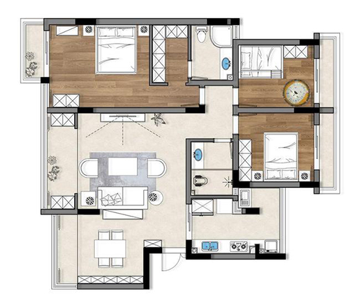 ?、贆M廳的設計減少了純過道的面積,提高了空間的使用率。