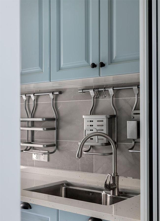 櫥柜的霧霾藍,在空間顯得低調(diào)又不突兀,配合金屬質(zhì)感的廚具,讓業(yè)主擁有美好的烹飪時光。