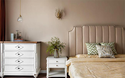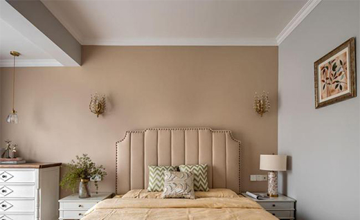 優(yōu)雅溫暖的主臥擁有利落的線條和清爽的色彩,空間布局簡潔。無論是吊燈,還是地板,都沒有瑣碎的設計。設計師把外陽臺拉進房間,增大了主臥的面積。奶茶色調(diào)呼應客廳,柔滑質(zhì)感的絲綢床品、黃銅的燈飾、花香的點綴,將空間曼妙輕盈的舒適感詮釋到了極致。