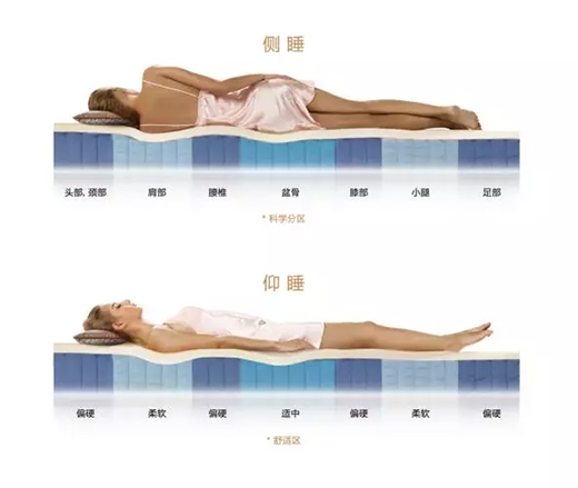 改變了傳統(tǒng)床墊分區(qū),根據(jù)人體睡在床墊上各個不同的著力點,推出更多配合頭、肩、背、腰、臀、腿、腳七個部位不同著力要求而設計的七區(qū)床墊,讓床墊更符合人體曲線,給喜歡變換不同睡姿的人提供恰到好處的支撐,更好地緩解肌肉緊張,讓睡眠更加舒適。