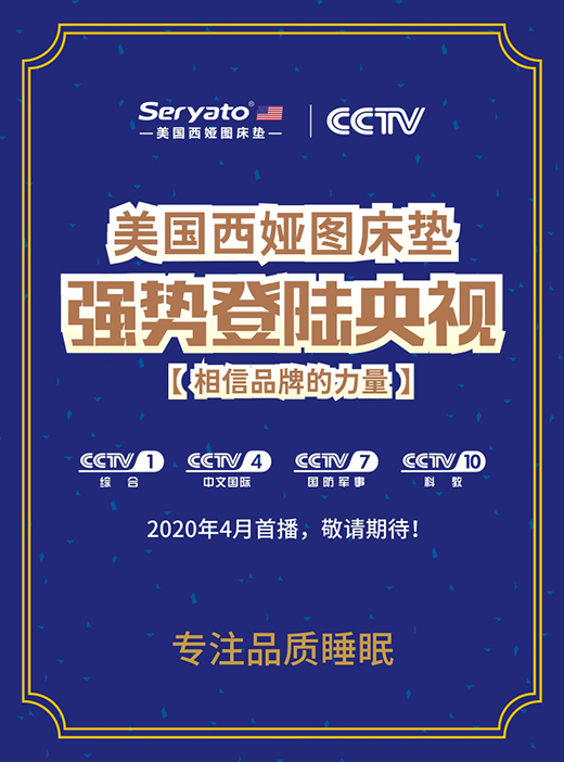 2020年4月29日,Seryato西婭圖品牌將以國(guó)際視野開(kāi)啟品牌、產(chǎn)品全面升級(jí)的序幕,成功簽約中國(guó)CCTV-1、CCTV-4、CCTV-7、CCTV-10頻道,向全球消費(fèi)者傳遞Seryato西婭圖卓越的品牌價(jià)值。
