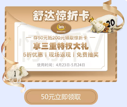只要50元,就能領(lǐng)取價值200元的驚折卡。持卡才能擁有驚折活動5折購買床墊的權(quán)限哦。還能在活動落地當(dāng)天(5月24日)享受返現(xiàn)補(bǔ)貼和現(xiàn)場抽獎。