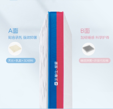 床墊AB雙面睡感,適配成長所需。A面天絲+乳膠+3D材料,貼合承托強效抑菌。B面精鋼彈簧+環(huán)保代棕棉,加硬睡感,科學護脊??萍夹沦F3D材料,144萬支撐點,密集支撐,硬而不僵,軟而不塌,強力護脊,精準承托。