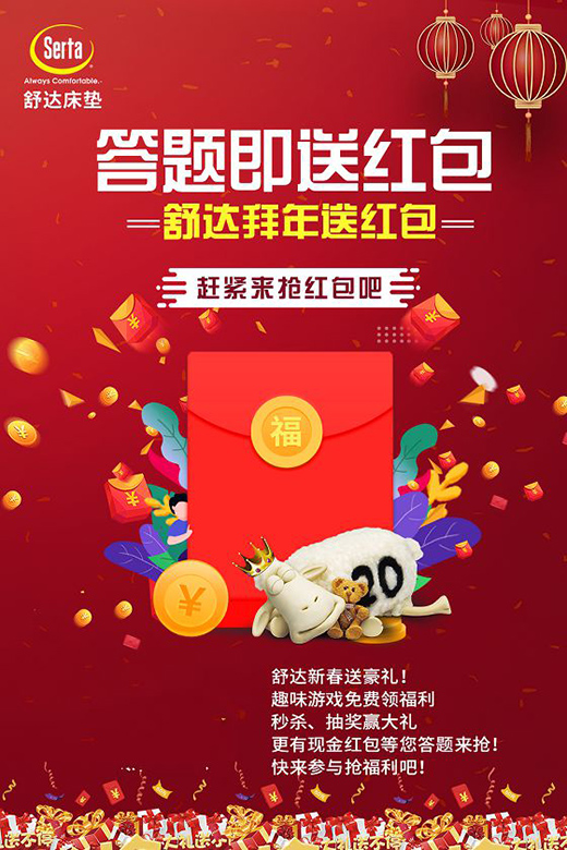 線上直播陪您過大年、秒殺、免費(fèi)抽獎(jiǎng)、驚喜折扣、答題搶紅包、枕頭游戲等一系列鉅惠活動(dòng)砸來,舒達(dá)玩出了牛年Style,將一場(chǎng)周年春節(jié)優(yōu)惠活動(dòng),做成了全民狂歡!