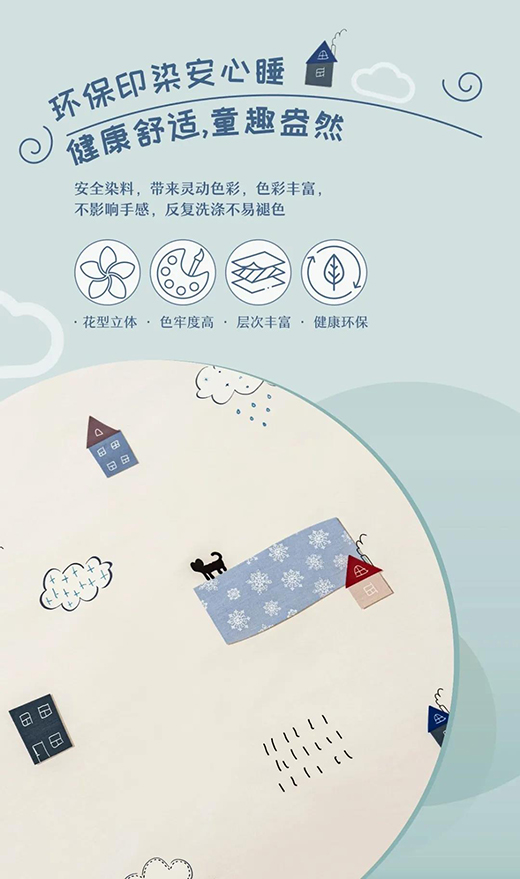 全棉纖維紡織品根據(jù)棉花的種類和品質(zhì)、工藝的差異等,又分為普通純棉、絲光棉、匹馬棉等、陽光棉等。 陽光棉是錦葵科、棉屬種質(zhì),原產(chǎn)地在美國,通常享受較長的日光照射,棉花纖維絲具有光亮葉雜少、棉質(zhì)細(xì)膩、柔韌等突出優(yōu)勢。陽光棉在化妝棉、嬰幼兒衣物等領(lǐng)域的應(yīng)用較為普遍,不易變形、不傷皮膚。雅蘭“趣味小鎮(zhèn)”四件套使用的,正是陽光棉。